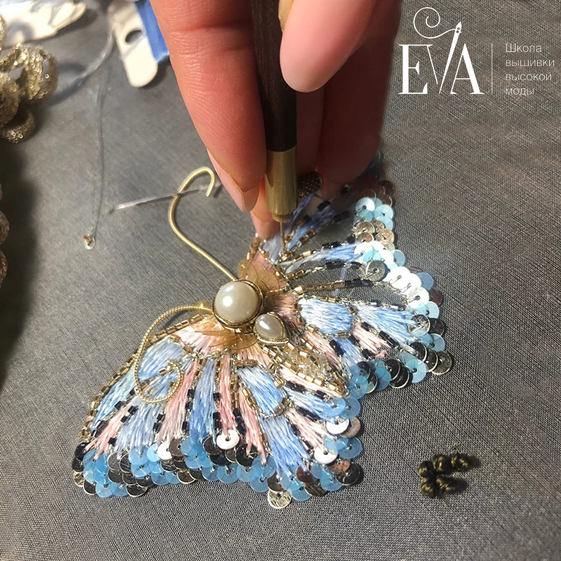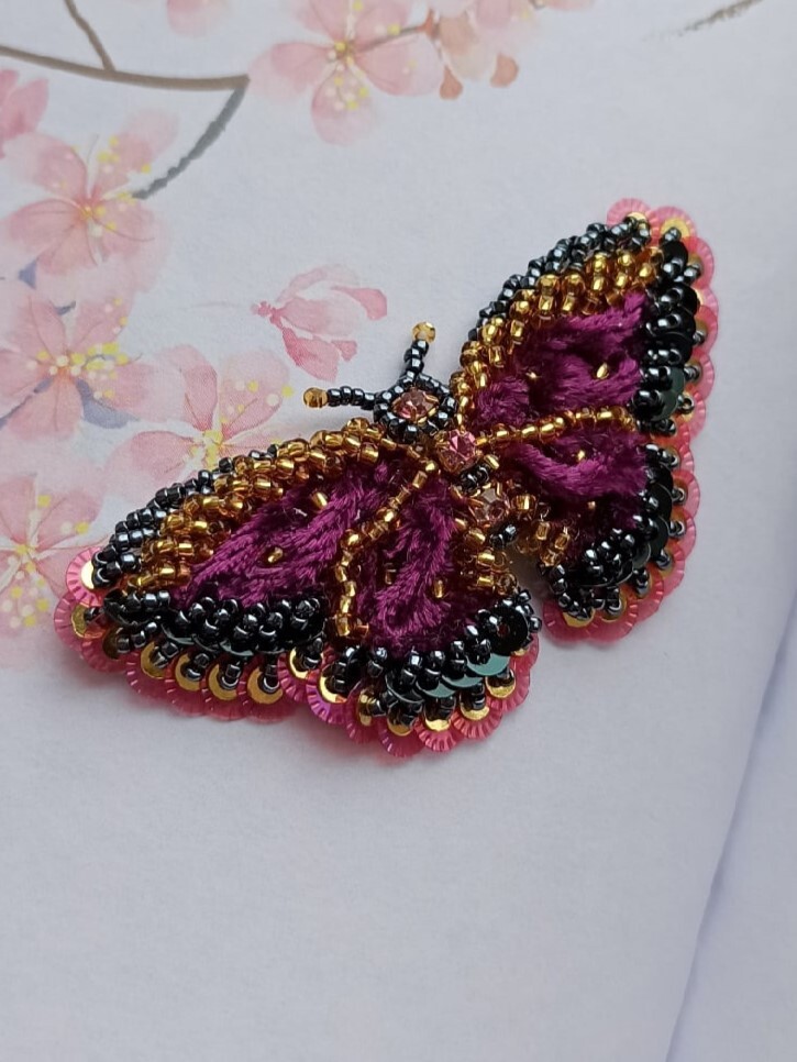 "Готова моя бабочка по марафону от @eva_embroidery. 8,5 на 5 сантиметров получилась. Шикарно будет смотреться на вечернем платье! Огромное спасибо Евгении за подробные объяснения. Очень интересный опыт получила, жду не дождусь, когда начнется курс Художник по вышивке."